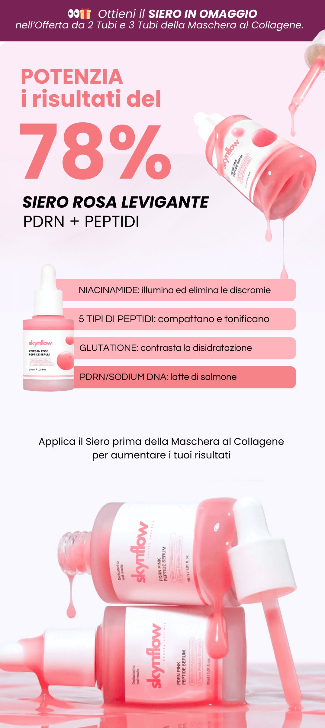 La Maschera al Bio-Collagene di Skynflow è formulata in Corea da un laboratorio con 70 anni di esperienza.
