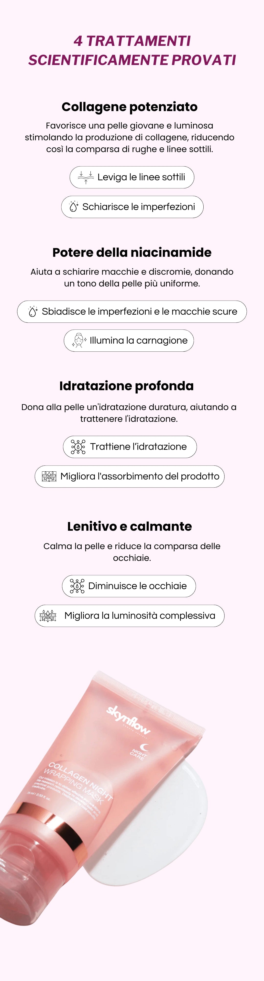 Pelle più luminosa e liftata già dopo una sola notte di applicazione.